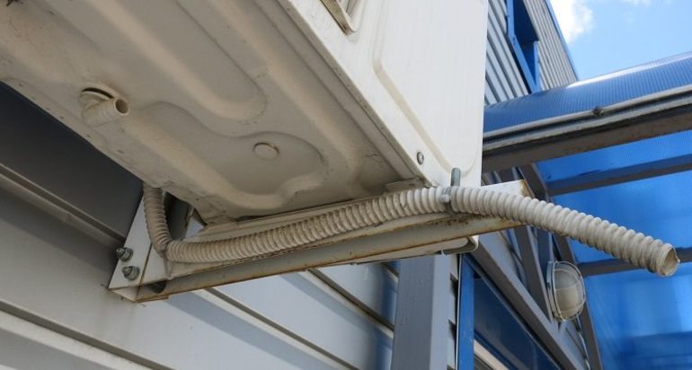- Промываем дренажный шланг. Можно приспособить какую-либо трубку и водой изо рта продуть шланг. Через него на улицу может политься грязная вода, поэтому убедитесь в отсутствии людей под окном.
