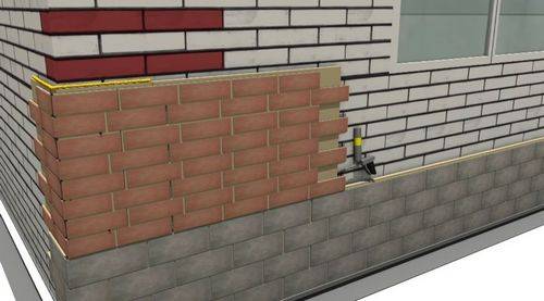 - Начальный облицовочный ряд монтируется на цокольный профиль. Для этого под каждую панель требуется нанести монтажную пену. Качественное соединение делается с необходимым выпуском на левом угловом стыке первой панели.
