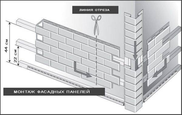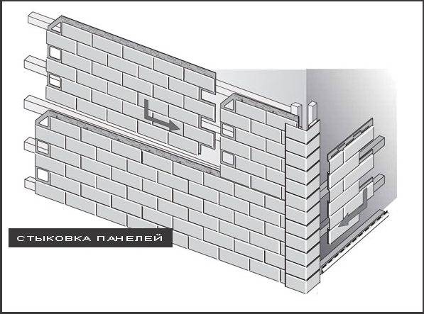 Для этой цели используется ручная циркулярная пила. В том случае если обшивка будет идти в несколько рядов панели необходимо располагать в разбежку для создания эффекта естественной кирпичной кладки - Фиксация всех элементов осуществляется таким же образом, как и в случае со стартовой полосой. Правильной крепление подразумевает наличие люфта – панели должны иметь возможность ходить из стороны в сторону;
