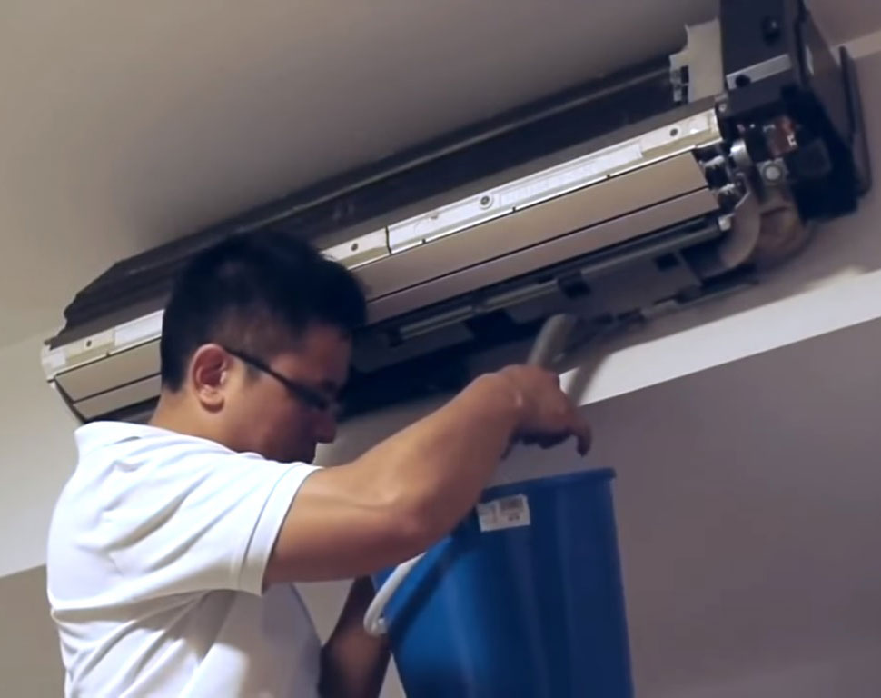Конденсат в кондиционере должен скапливаться в специальной ванночке, расположенной во внутреннем блоке. Если модуль висит на стене с наклоном, то и отсек для воды находится под углом. Жидкость в результате переливается через край ванночки либо просто течет мимо нее.