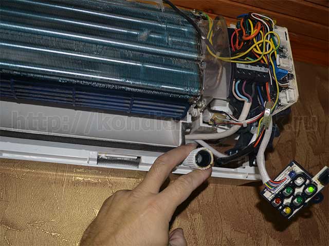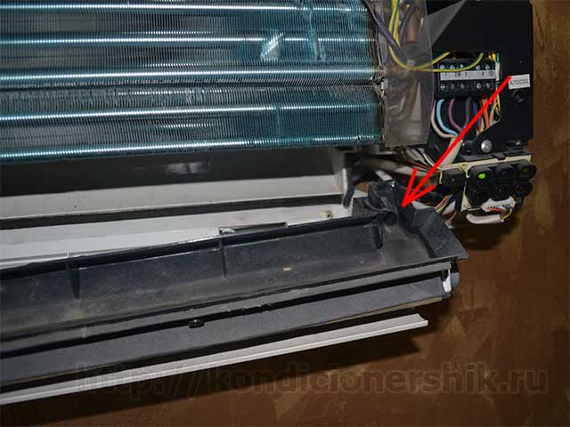 Чистку дренажа можно выполнить самому, но лучше довериться специалистам. Необходимо будет снять корпус внутреннего блока, под которым вы увидите лоток (можно посмотреть в этой статье). К этому лотку подсоединен дренаж. Внимательно осмотрите детали и найдите место соединения. Вы увидите отверстие внутри лотка – оно может быть или слева или справа как на фото (вероятно потребуется слить скопившуюся воду). Через любую подходящую трубку (кондиционерщики используют медную) дренаж продувают обычной водой, набрав её в рот. Вся грязь выйдет под давлением воздуха и воды на улицу (при этом смотрите, чтобы никому наголову «не прилетело»). Если трубка выведена в канализацию, то решается данная проблема только при плановом сервисном обслуживании сплит-системы.
