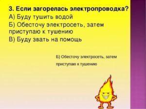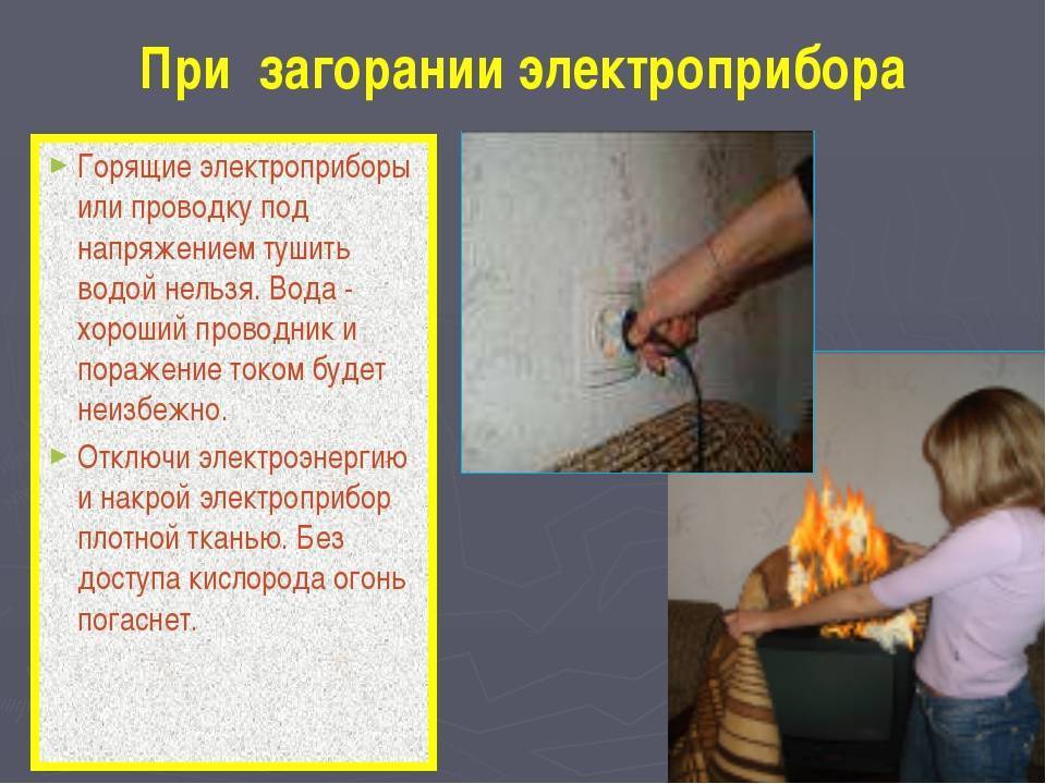 - прежде чем пытаться потушить пламя, возникшее на проводах, необходимо отключить электричество;