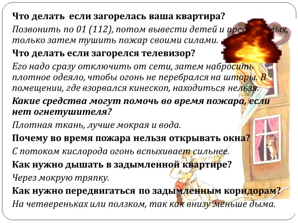 - Распорядиться, чтобы женщины, дети немедленно вышли в подъезд, начали оповещать соседей по дому и вызывать пожарную команду.