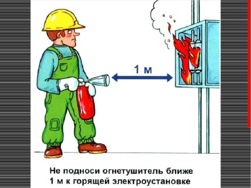 - Используемые средства пожаротушения не должны проводить ток.