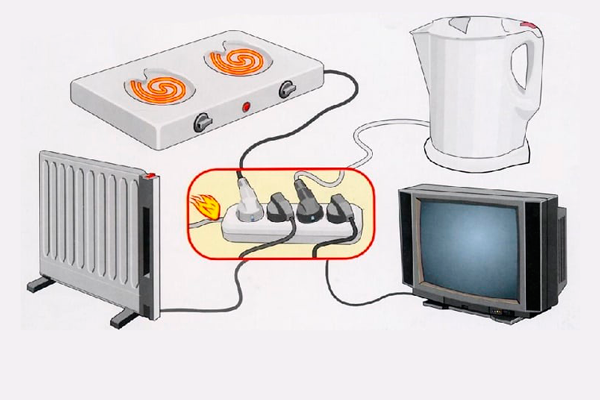 Не стоит включать в сеть сразу несколько мощных приборов. Если вы одновременно включите в одну розетку компьютер, стиральную машинку, чайник, телевизор и утюг, может произойти перегрузка электросети. В лучшем случае случится перегрузка сети и отключение устройств. В худшем — возгорание.