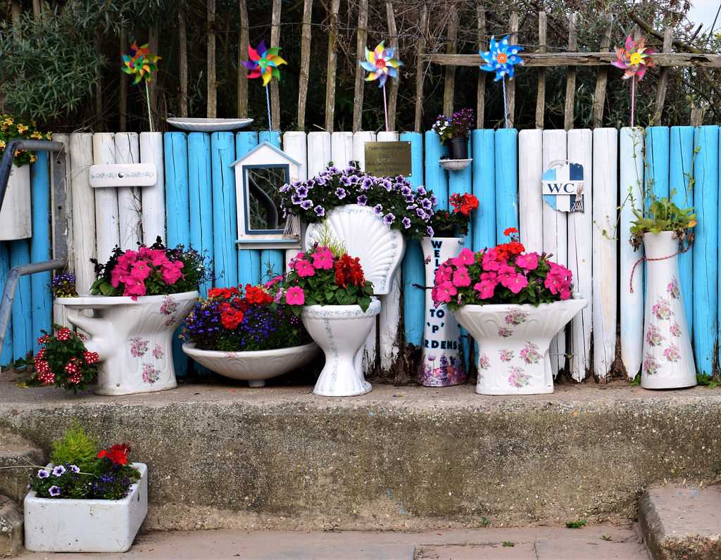 - Цветники из старых ведер. Вторую жизнь можно найти прохудившимся ведрам. В них можно посадить цветы, а затем развесить на деревянной или металлической конструкции, формируя определенную композицию. При желании можно на стенки нанести разноцветный узор.