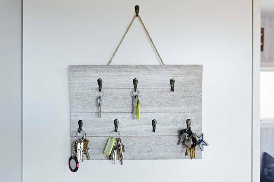 Сделанная своими руками из остатков ламината ключница подойдет для использования в прихожей. Ее выпиливают из цельного куска материала, к стене прикрепляют вместе с крючками, либо на подвесных уголках. Чтобы материал не боялся влаги, торцы ключницы окрашивают или покрывают лаком.