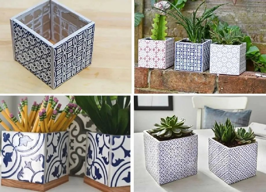 Пять плиток, соединенных между собой в форме – красивое кашпо под комнатные растения. Элементы склеиваю по граням в виде куба, оставляю сохнуть. В емкости легко спрятать невзрачный горшок кактуса. После полива просто убираю остатки влаги и возвращаю растение на место.