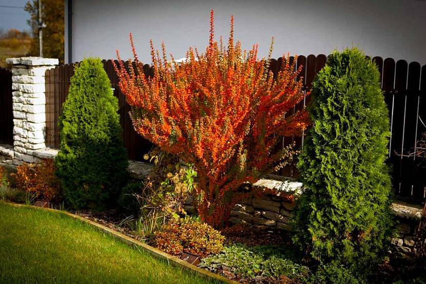 Барбарис на клумбе вдоль деревянного штакетникаИсточник krovlsale.ru