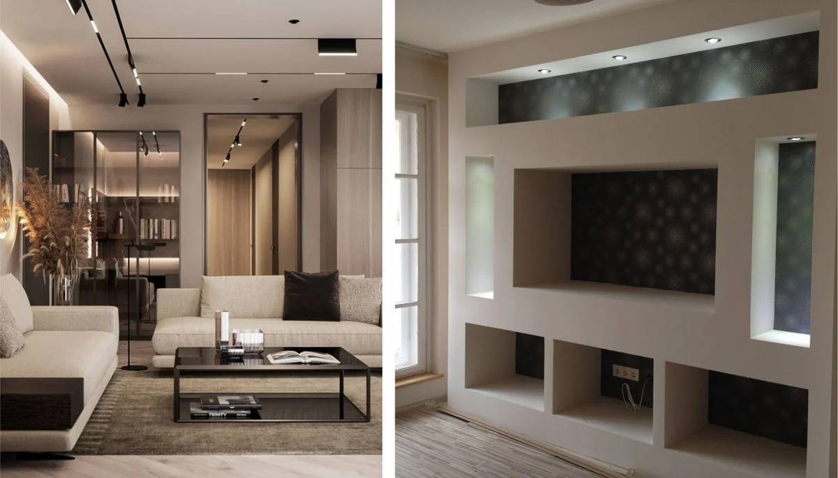 Откуда такая любовь к резьбе по гипсокартону? Все эти искусственные конструкции смотрятся очень громоздко. Произвести впечатление на гостей можно и по-другому. Все понимаем, ожидали, что будет круто и соседи скажут “Вау!”. Но, громоздкие гипсокартонные конструкции не экономят пространство, а воруют его. А еще искренне верили, что получится изящный декор? Увы, без знаний часто получается как на первом фото. Есть более тонкие детали, например, лепнина, картины, текстиль, функциональные ниши. Они делают пространство ярким и интересным, а не воруют его.