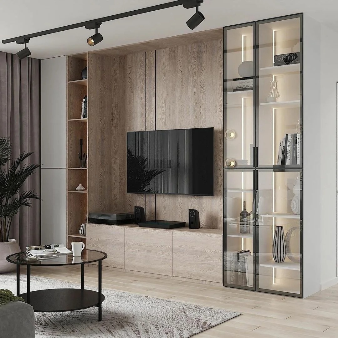 Возникает логичный вопрос: «а где же тогда хранить все накопленные элементы декора?», на самом деле совсем не обязательно полностью отказываться от систем хранения для декора. Для того чтобы интерьер был не только стильным, но и практичным, системы хранения стоит применять со стеклом и декоративной подсветкой.