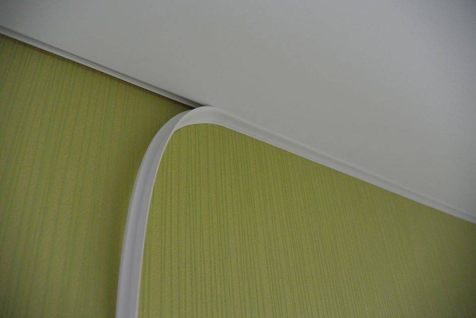 - Когда полосы заходят под багеты, не видно стыка между стеной и потолочной пленкой. При «ровных» руках отделочника этого стыка не будет видно в любом случае, кроме того, существуют специальные плинтуса и прочие фасонные части для того, чтобы скрыть границу материалов и сделать красивый переход.
