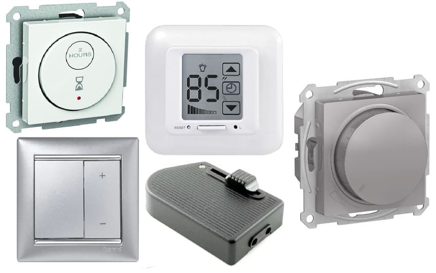 Производятся поворотные, клавишные, сенсорные, поворотно-нажимные модели. Электротехника отличается сложностью, функционалом, ценой. Поворотные регуляторы простые, доступные, но не долговечные. Не все имеют функцию запоминания настроек. Более совершенные поворотно-нажимные модели. Клавишные отличаются сложностью, надежно служат устройства с хорошим качеством исполнения. Самыми функциональными и долговечными являются сенсорные регуляторы, способные с высокой точностью задавать степень интенсивность освещения.