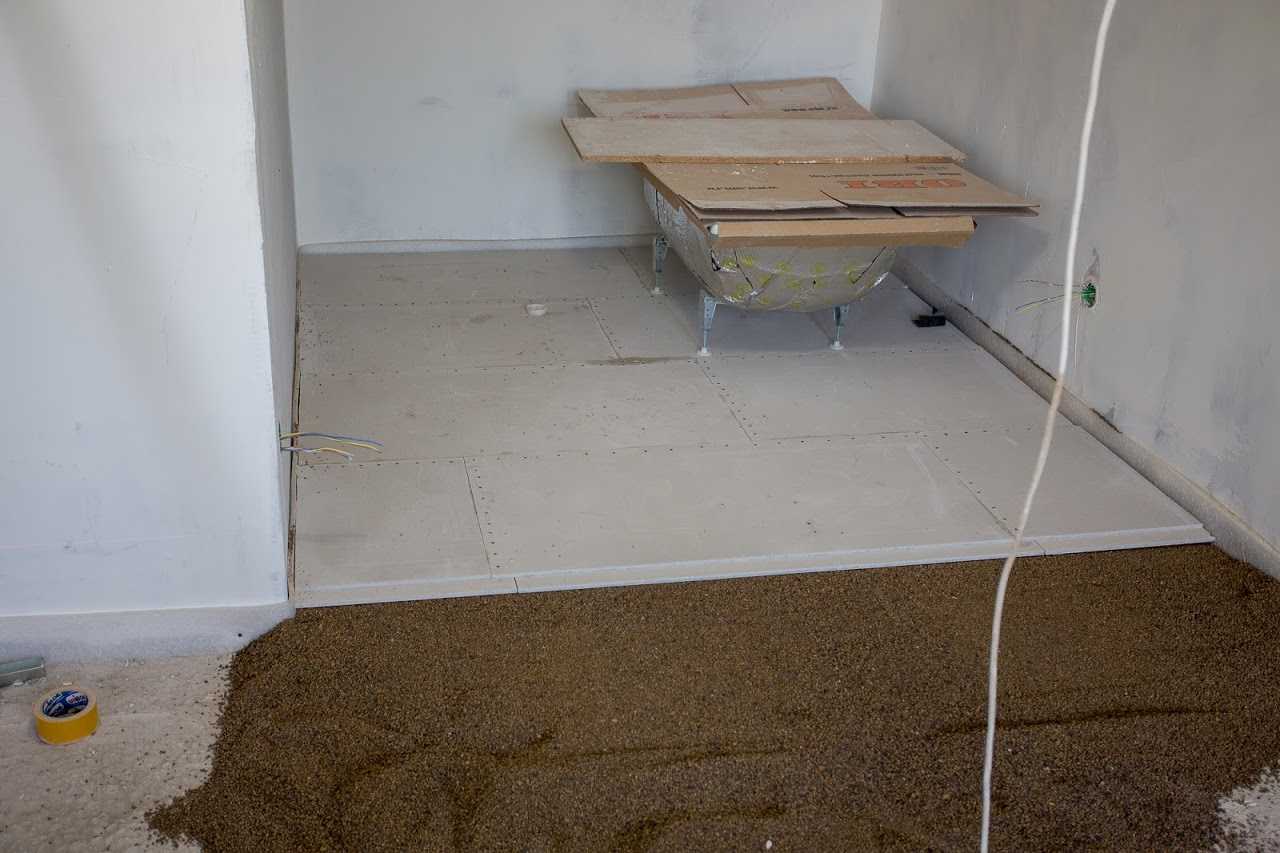 Прежде, чем осуществлять монтаж листов ГВЛ на пол, необходимо тщательно подготовить основание. Старое покрытие обязательно нужно убрать, а весь мусор – удалить. Отдельного внимания заслуживают даже загрязнения, которых, в идеале, быть не должно – они не способствуют адгезии. Неровности и дефекты необходимо устранить при помощи раствора цемента, из которого делается стяжка. Затем на пол укладывается слой гидроизоляции. При необходимости прибегают к подсыпке керамзита, это делается для дополнительной теплоизоляции пола. После вышеперечисленных действий можно переходить непосредственно к укладке листов из гипсоволокна.