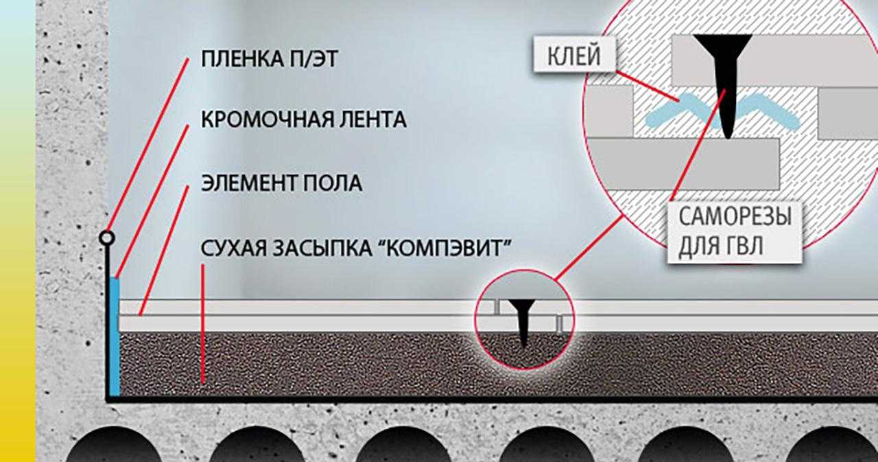 Второй момент. При укладке на сыпучее основание или на лаги, ГВЛ на пол кладут либо повышенной плотности (элементы пола), либо влагостойкий в два слоя.