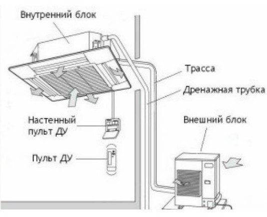 Как и обычные сплит-системы, кассетный кондиционер включает в себя наружный и внутренний блок. Наружный располагается с внешней стороны помещения, а внутренний устанавливается в межпотолочном пространстве и маскируется за подвесным потолком. При этом передняя панель соответствует размеру плиты подвесного потолка, поэтому она органично встраивается в помещение. Такие установки могут использоваться для офисов, конференц-залов, кинотеатров, ресторанов и других просторных помещений любого назначения.