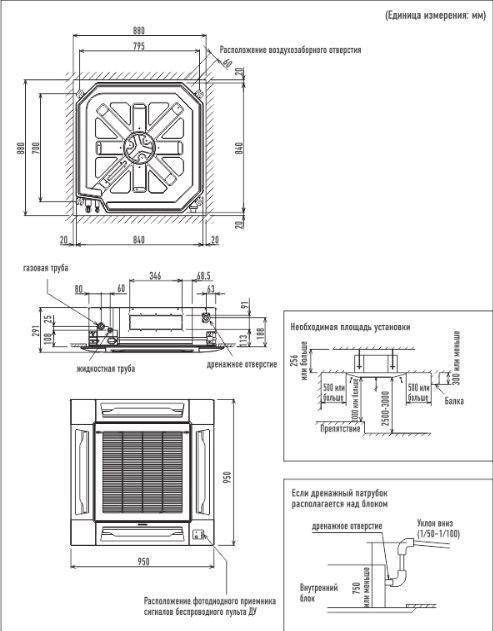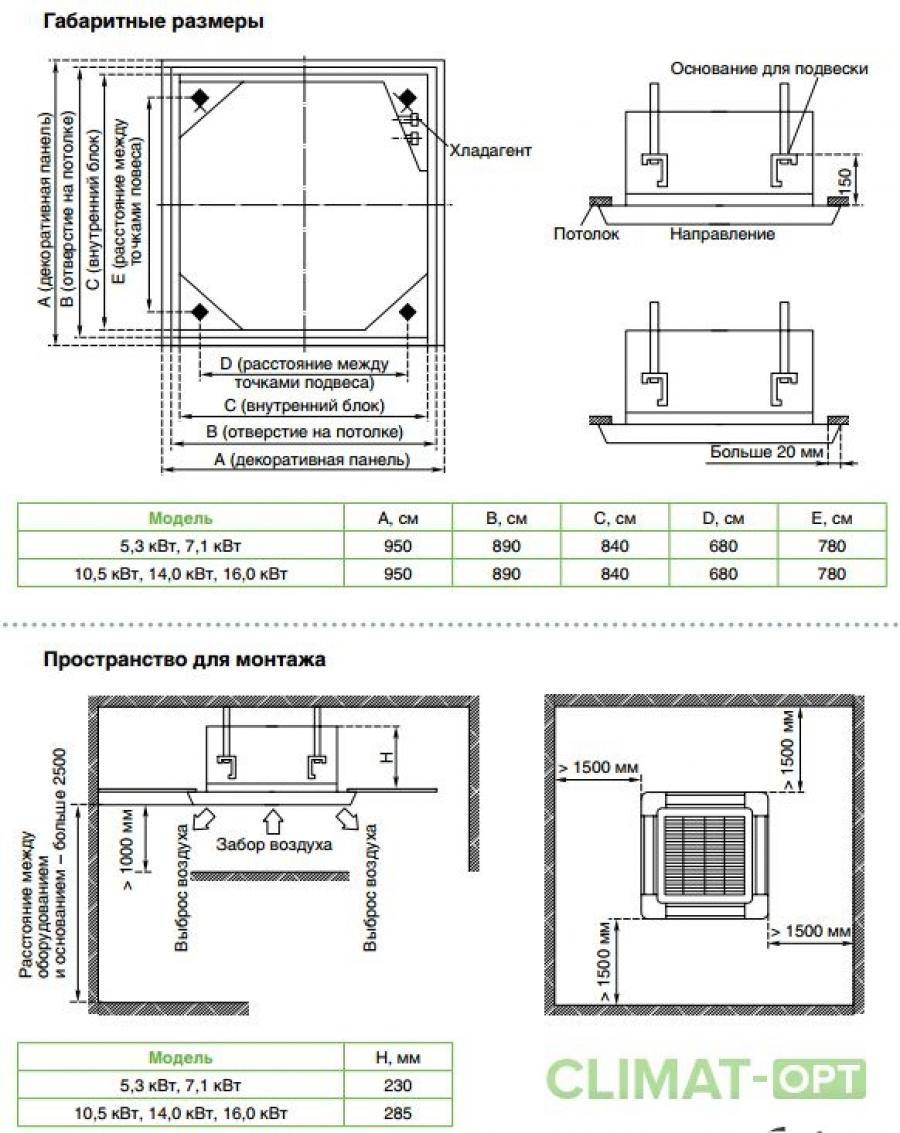 Отсюда же вытекает и основное требование к монтажу кассетных кондиционеров — наличие подвесного потолка (например, армстронг). Поскольку кассетная сплит-система крепится к капитальному потолку, необходимо минимальное межпотолочное пространство в 35-45 см. Также, мы рекомендуем устанавливать подобные системы кондиционирования только в помещения с высотой потолков не менее 3х метров.