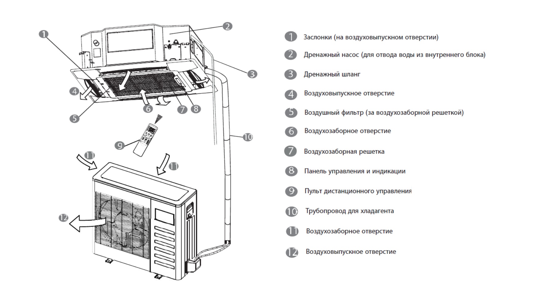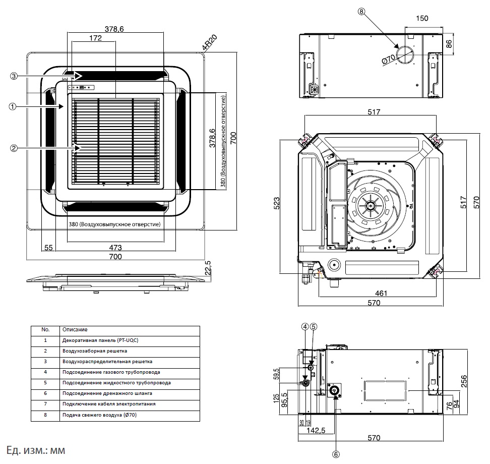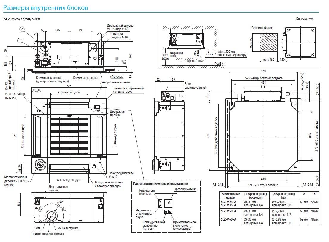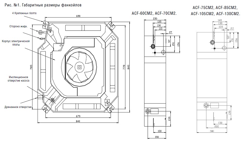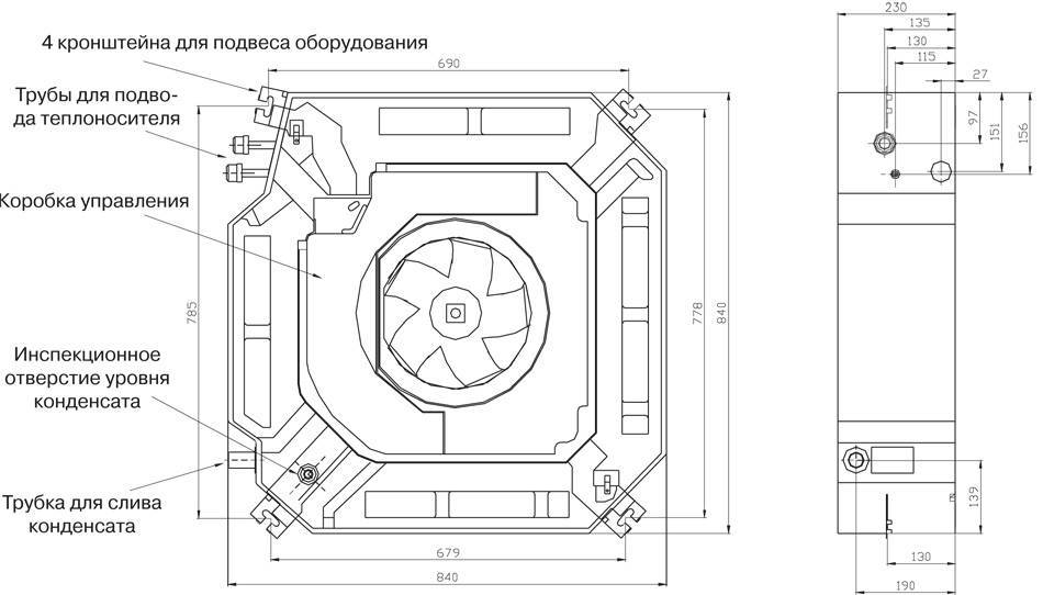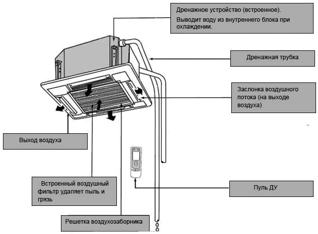 Рабочий блок кассеты, «спрятанный» под фальш-потолком, является частью холодильной конструкции, включающей: испаритель, вентилятор, устройство отвода конденсата, узлы подключения линий от наружного модуля, плату электрических соединений.