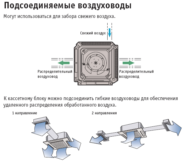 Внутренний блок кассетного типа устанавливается так, чтобы лицевая панель расположилась на одном уровне с поверхностью потолка. Если кондиционер включает систему подмеса воздуха наружного обращения, воздуховод выносят наружу, после чего крепят очистительный фильтр и воздушную заслонку. При работе оборудования воздух будет охлаждаться и разбавляться свежим, предварительно очищенным потоком с улицы.