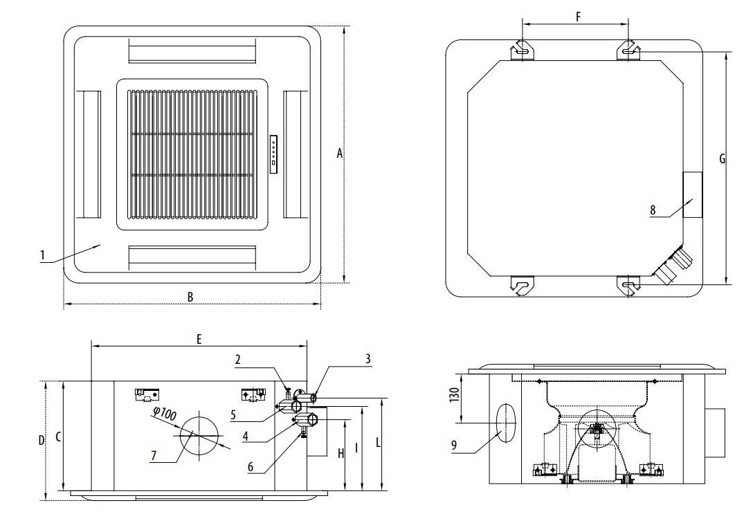 Эта часть кондиционера выполнена в виде рабочей блочной кассеты с панелью, предназначенной для встраивания в потолочную конструкцию. Причём потолочная конструкция должна иметь так называемый фальш-потолок.