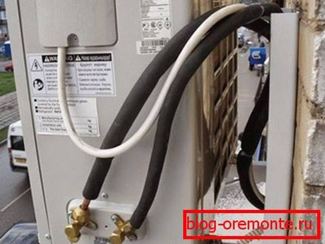 Компрессор и конденсатор объединяет холодильный контур, заправляемый фреоном, от которого через пару линейных запорных кранов сделаны контактные точки для соединения с внутренним блоком.