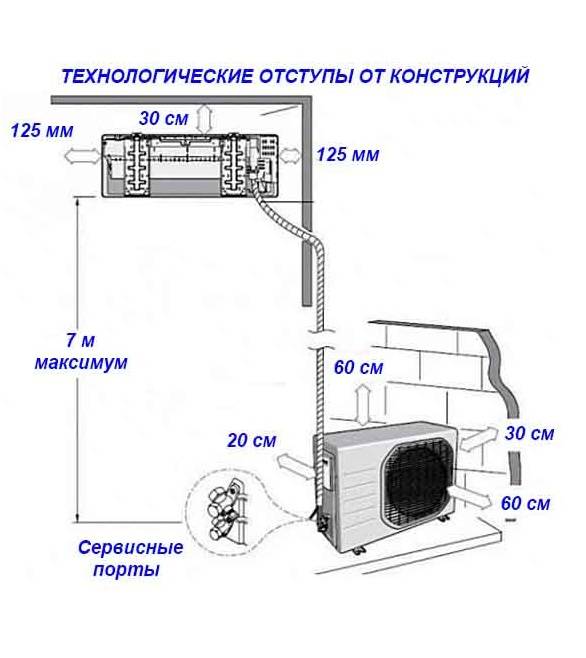 Максимальная длина межмодульной трассы — 6 м, при превышении понадобится дополнительная закачка фреона. Если наружный и внутренний модуль размещены на расстоянии 1 м, трасса не должна превышать 5 м. Излишки системы формируют в кольцо и располагают за блоком.
