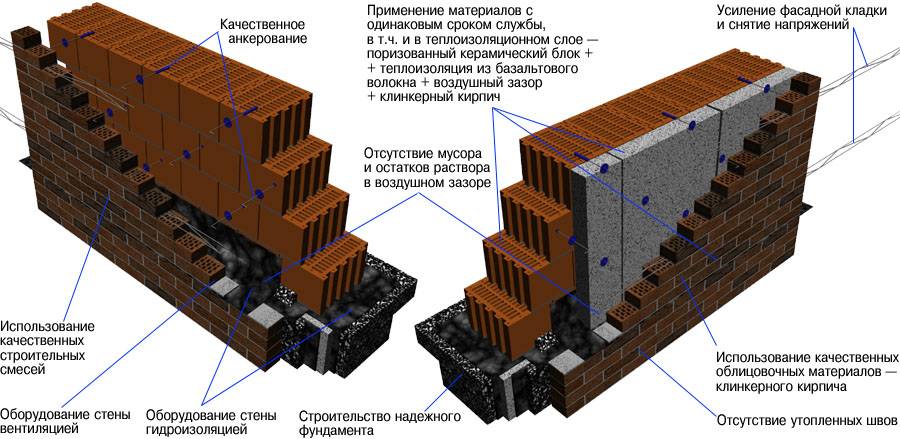 Облицовка дома клинкерным кирпичом производится на десятилетия. Наличие на стенах каких-либо изъянов — вопрос, требующий полного и окончательного решения до укладки облицовочного кирпича, поскольку потом будет поздно.