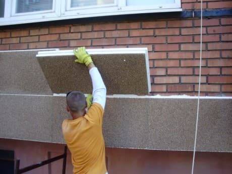 - Термопанели под декоративную штукатурку производят из пенопласта и наклеенного на него слоя мраморной крошки. Декоративный слой имеет размер 4-5 мм. Их устанавливают на специальный клей двумя способами: