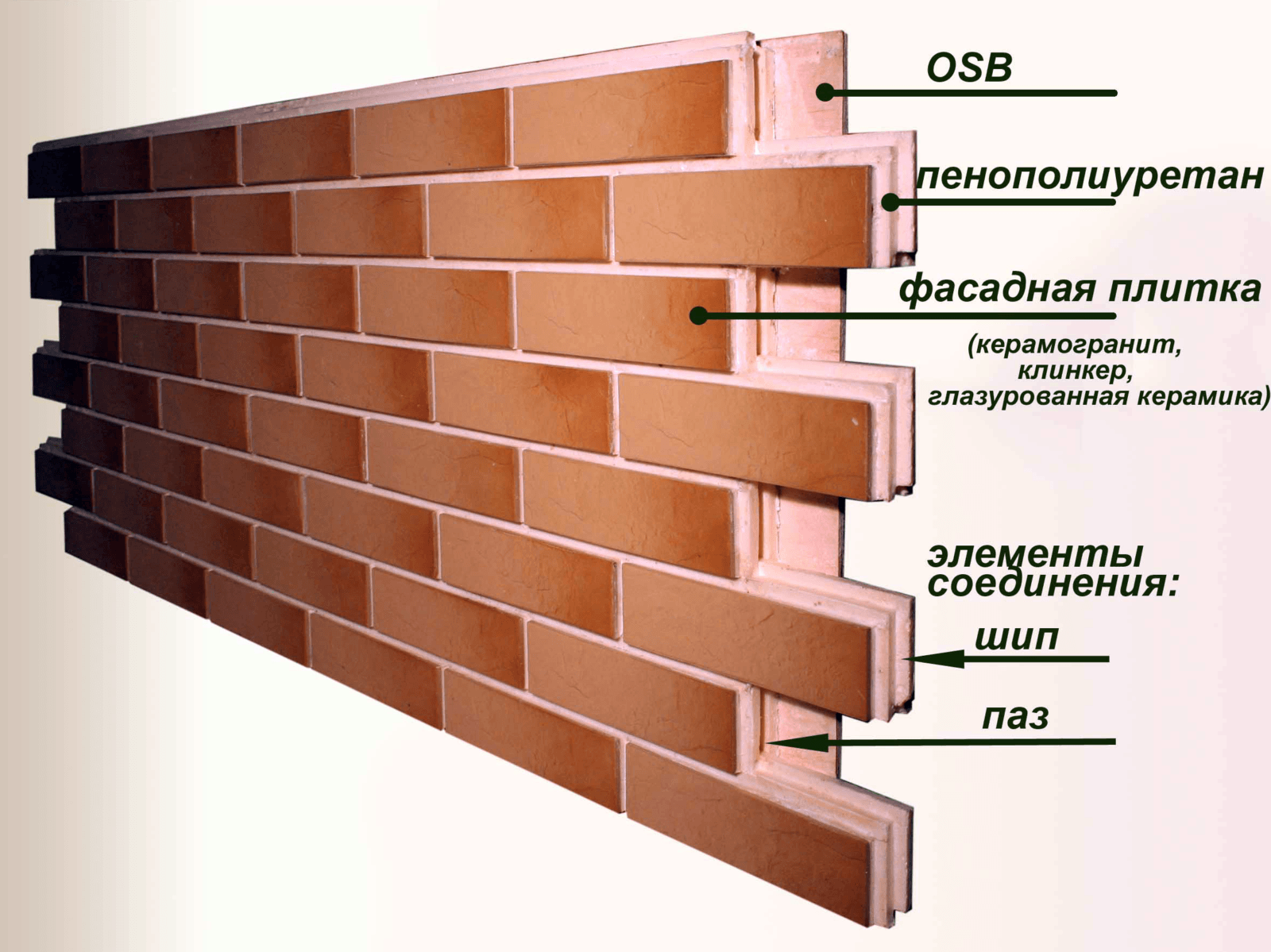 Чем меньше толщина плитки, тем легче панель. Именно клинкер составляет основную массу рассматриваемой облицовки для фасада. Полимерный теплоизолятор весит на порядок меньше. Толщина клинкерной плитки может быть от 8 до 12 мм. Чем она больше, тем красивей выходит оформление фасадов домов. Общий вес панели может достигать 16–17 кг.