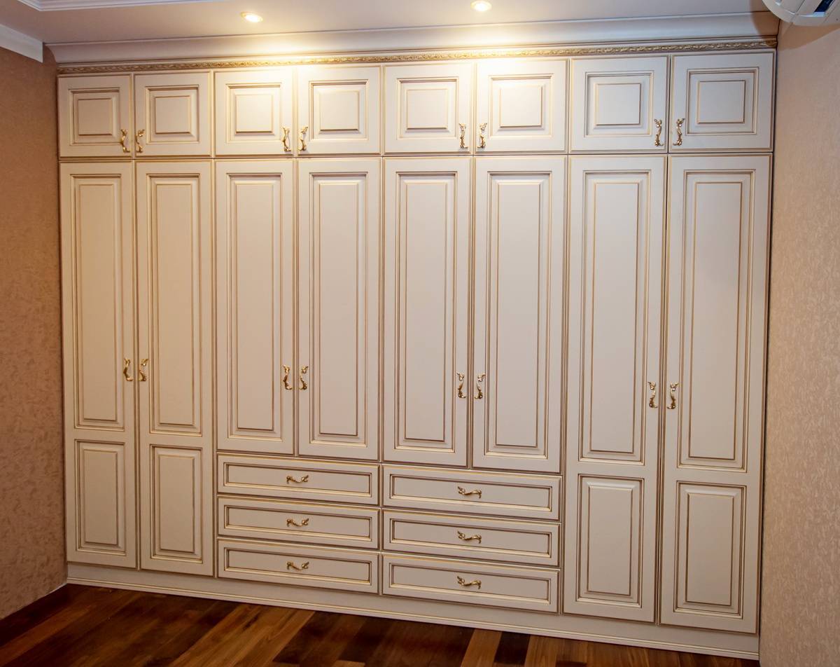Гардеробную в классическом стиле можно оформить с помощью резных деталей, плинтусов или пилястр. Для дверей применяют патинирование, золочение, а также используют специальные сетки для создания эффекта состаренности.