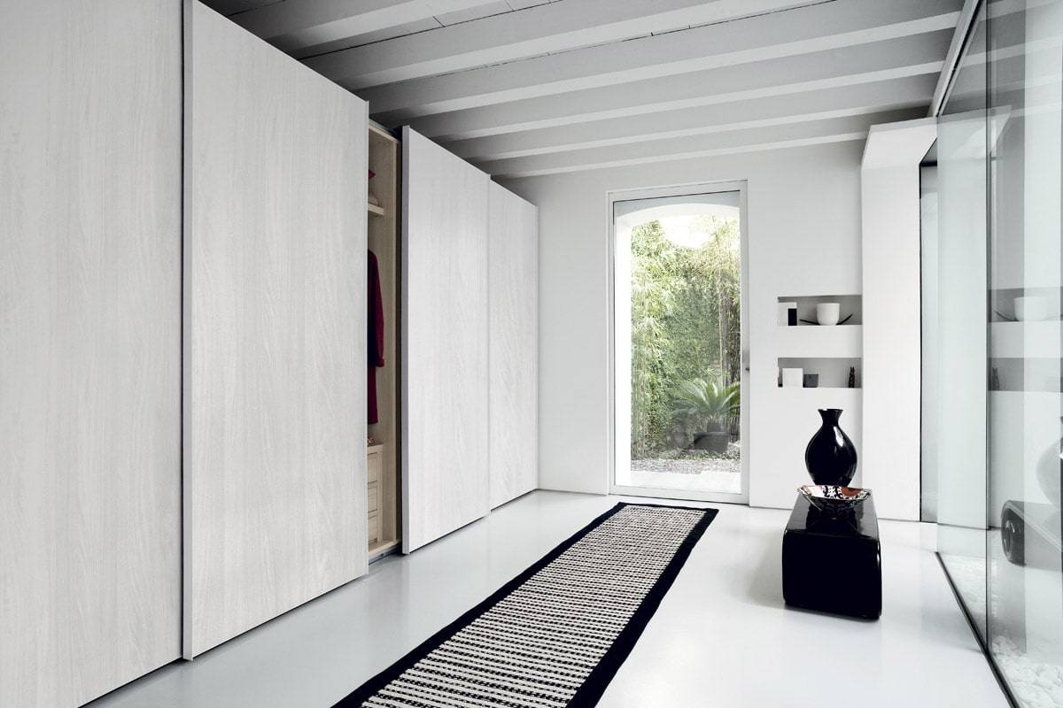 Гардеробная комната в мансарде, где используется ее боковая часть.Раздвижные двери по всей ширине, чтобы проще добраться до вещей.