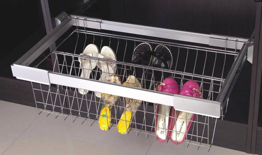 Выдвижные ящики | Аналог сетчатой выдвижной корзины, но выполнен из дерева или пластика, чаще всего используется в закрытых гардеробах. |