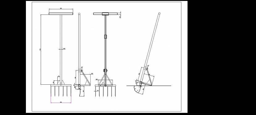 Используя чертежи, копалку для ленивых изготовляют для разного роста человека, чтобы ручки руля были на уровне груди, чтобы не сгибать позвоночник.
