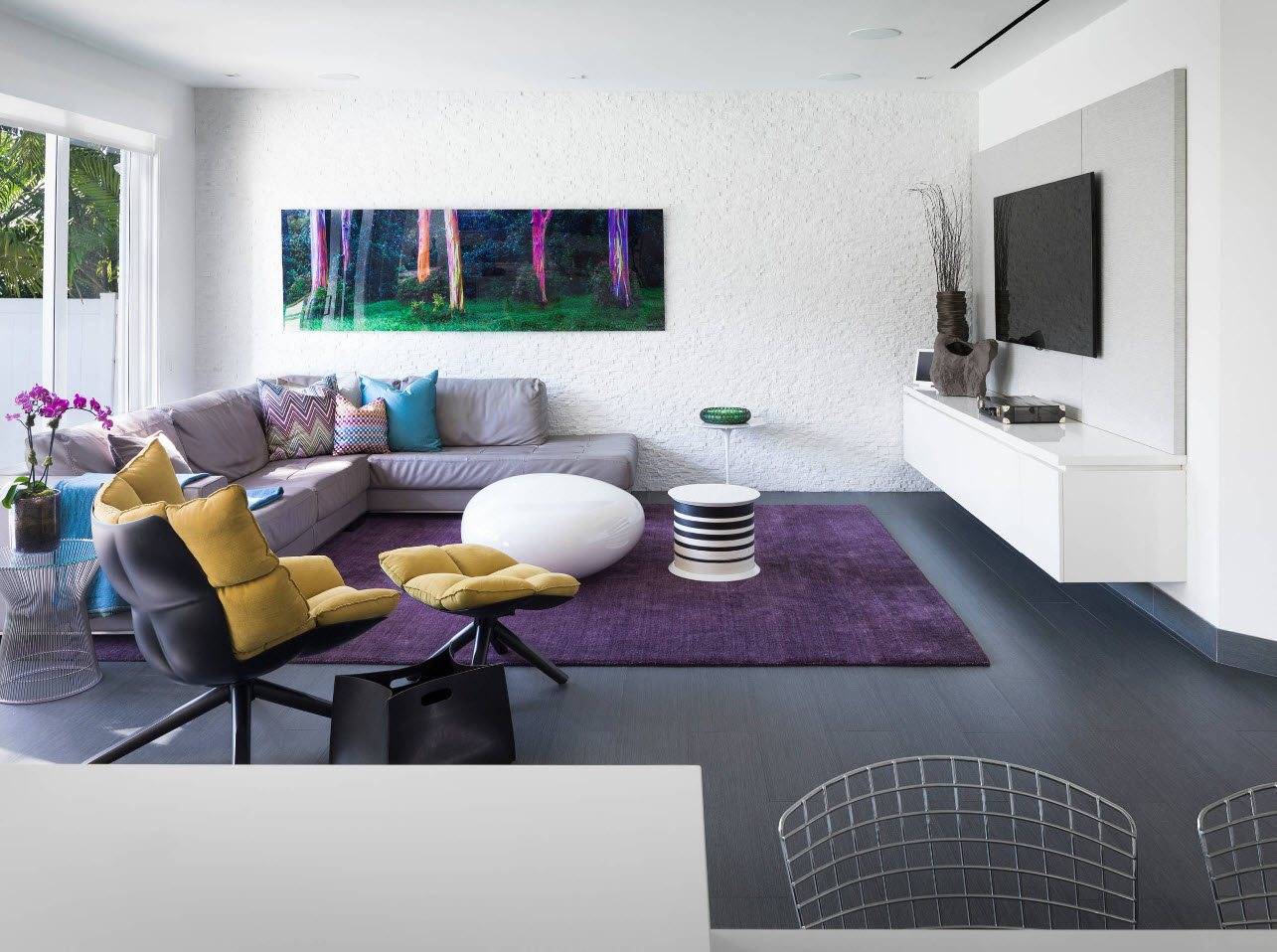 Белый цвет смягчает и разбавляет насыщенность вишневого или фиолетового, акцентируя на них внимание. Изысканно и стильно выглядит гостиная, в интерьере которой сочетаются светлые краски покрытия пола и стен с темными сочными «пятнами» в виде ковра, гардин, картинных рам