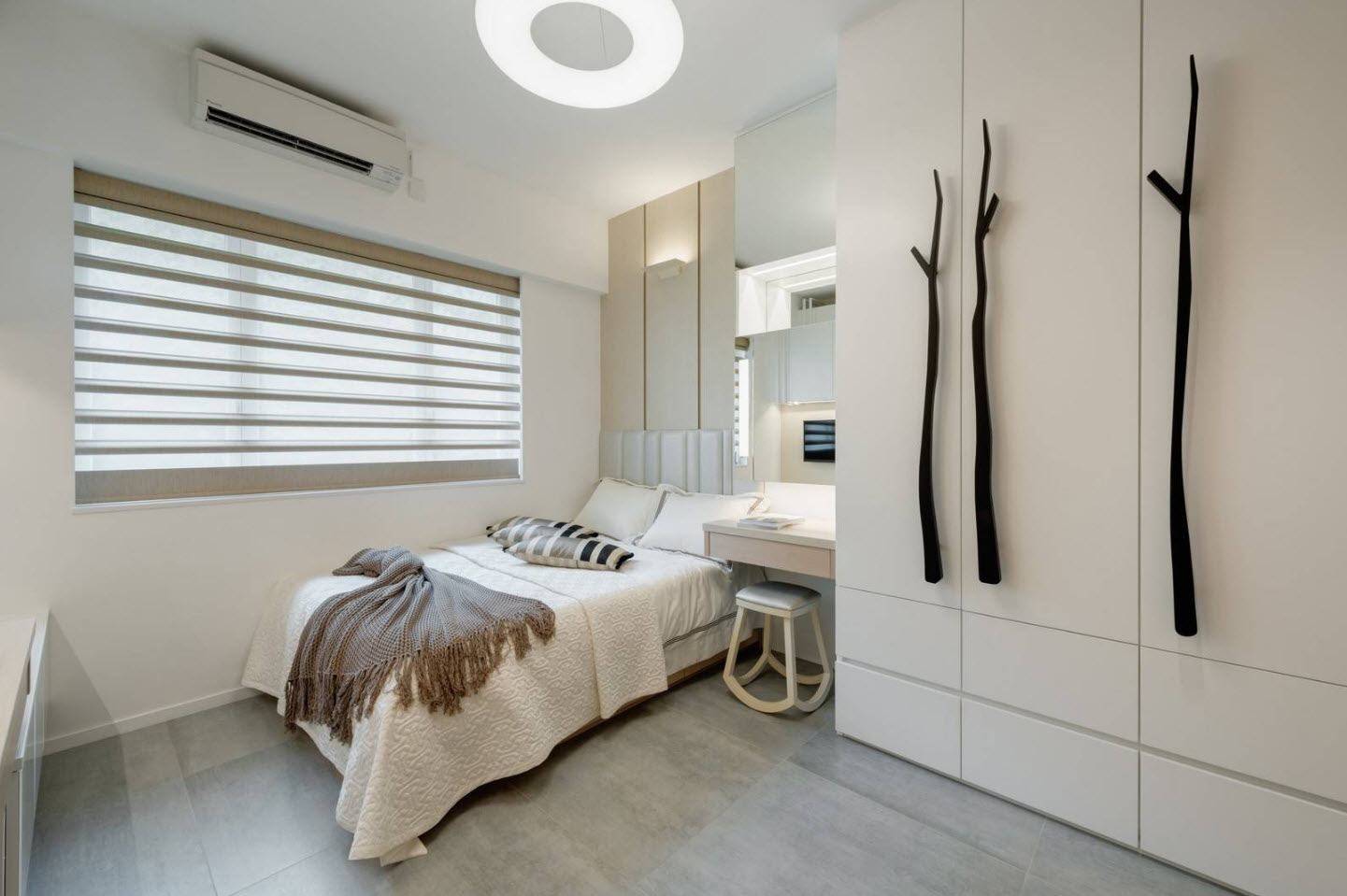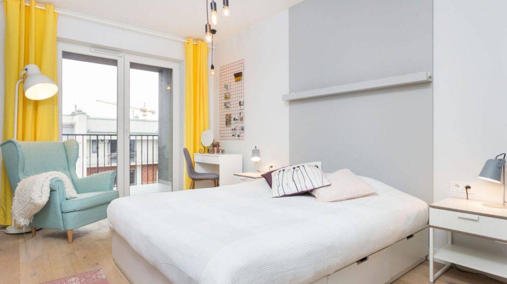 Для спальни можно выбрать более мягкие оттенки белёного дуба. Однако мы рассматриваем классический вариант. В этом случае, чтобы не получить слишком холодную и неуютную атмосферу, разбавьте интерьер тёплой мебелью, кремовым или бежевым постельным и шторами.
