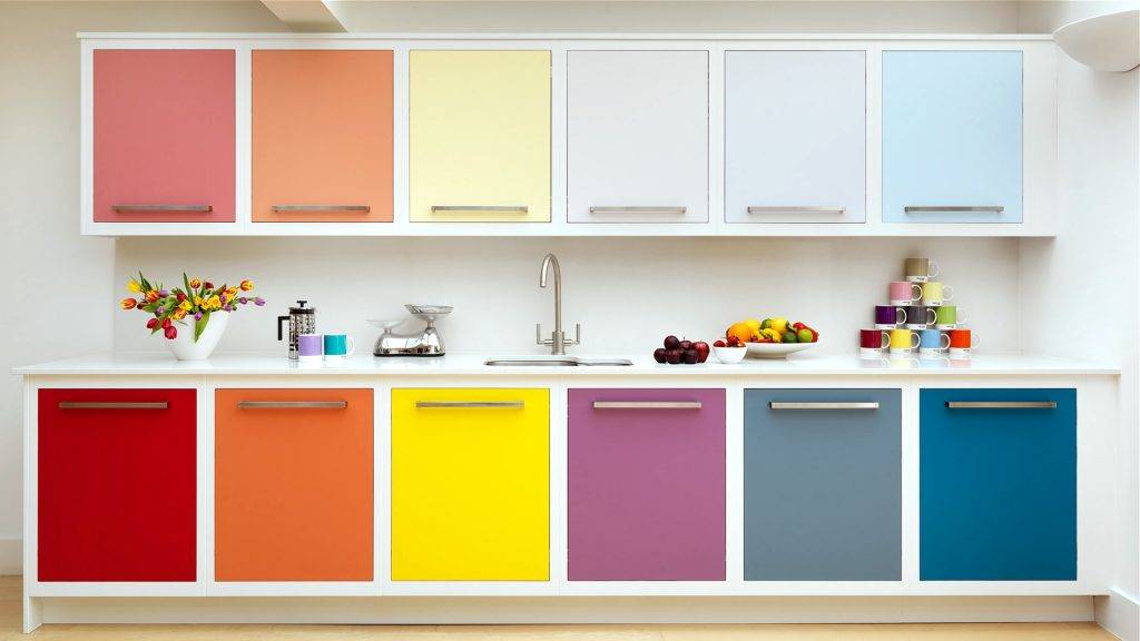 Яркие цвета будут уместны в том случае, если весь дизайн кухни выполнен в подобных оттенках. Выбирать цветовую гамму стоит из личных предпочтений и симпатий, ориентируясь на уже имеющуюся мебель, пол, стены.