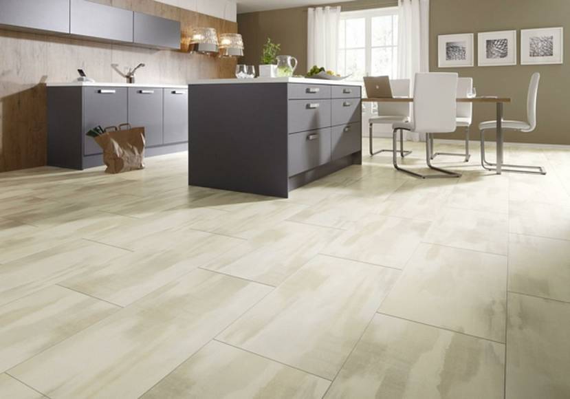 Покрытие под бетон, камень или гранит зрительно увеличивает комнату. Панель с глубоким рельефом красиво смотрится в бежевом, нежно-коричневом или холодном сером цвете. Ламинат гармонирует с белыми и темными оттенками мебели. На теплом полу не видны разводы и пыль.