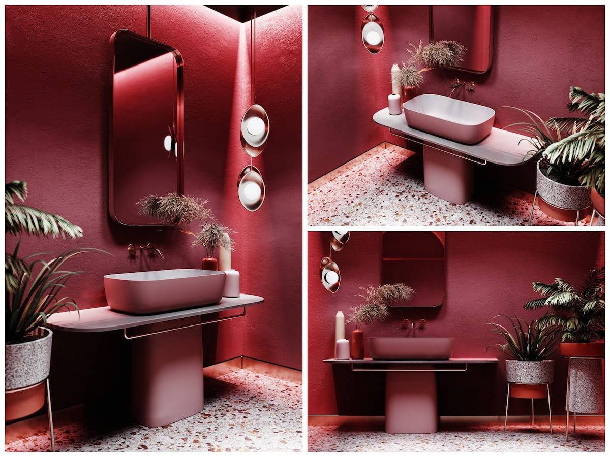 Яркая и нарядная ванная комната розового оттенка отлично сочетается с зеленью декоративного дерева. Такая ванная комната подойдет для юной модницы.
