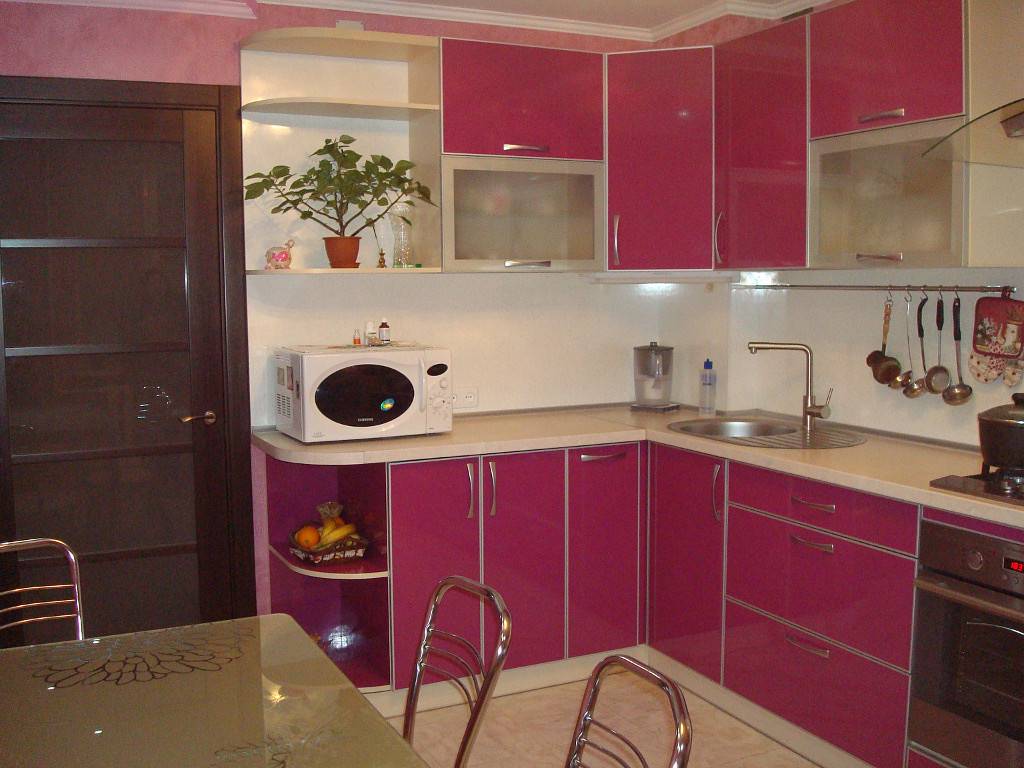 Подобную кухню можно оформить практически в любом стиле интерьера: от классического до хай-тека, если выбрать подходящие тона. Эффектный прием — комбинация белых шкафчиков и нижних ящиков цвета фуксии. Таким образом кухня выглядит гармонично и, как ни странно, визуально становится выше и просторнее.