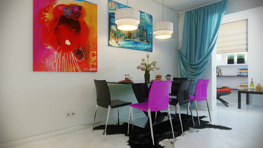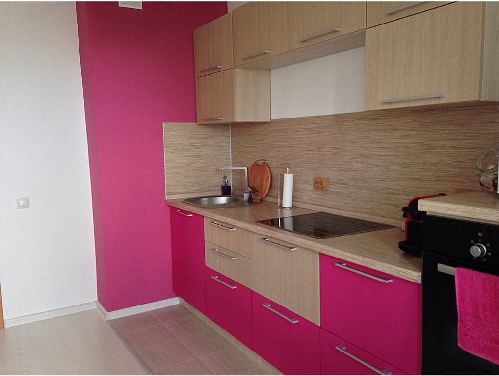При нейтральном оформлении интерьера, сделать мебель с фасадами и/или обивкой цвета фуксии. Этот прием популярен при оформлении кухни. При общем нейтральном оформлении яркая мебель очень хорошо смотрится. Неплох такой подход и при оформлении гостиной или спальни. Получаются очень даже интересные интерьеры. С одной стороны нескучные и яркие, с другой — не слишком перегруженные цветом.