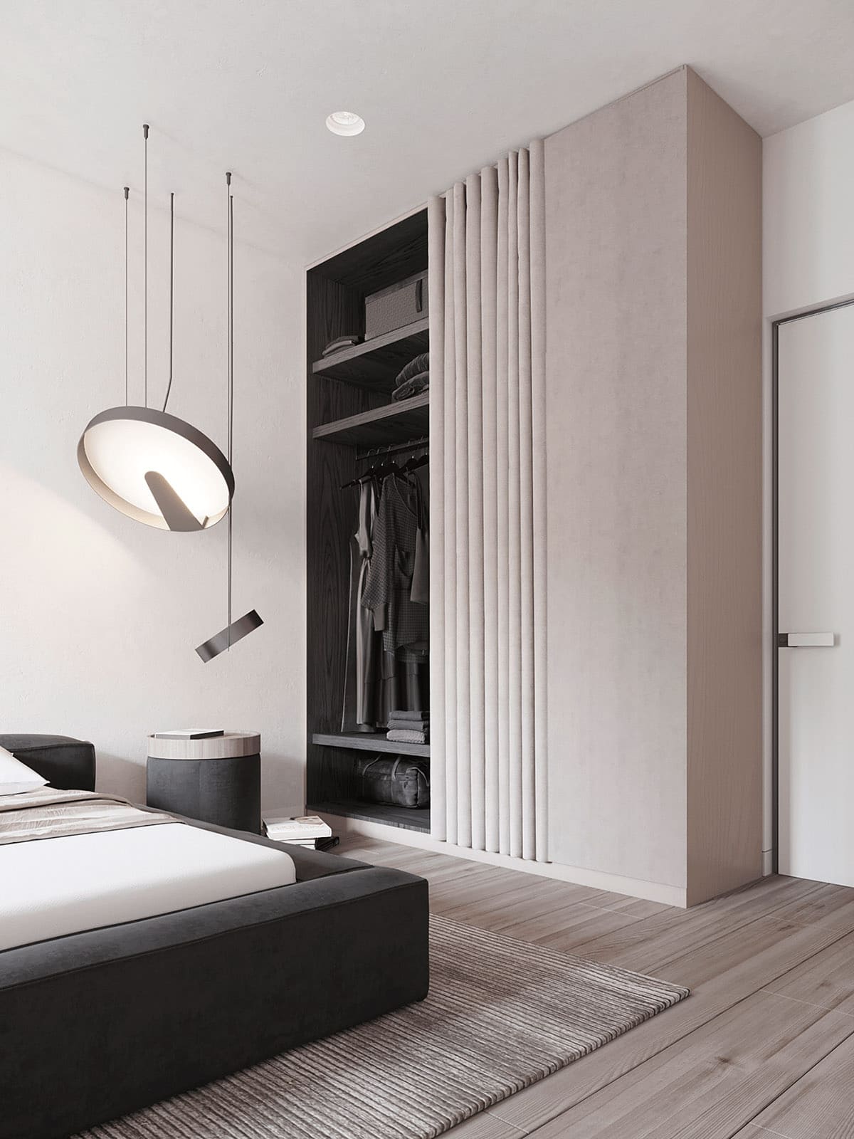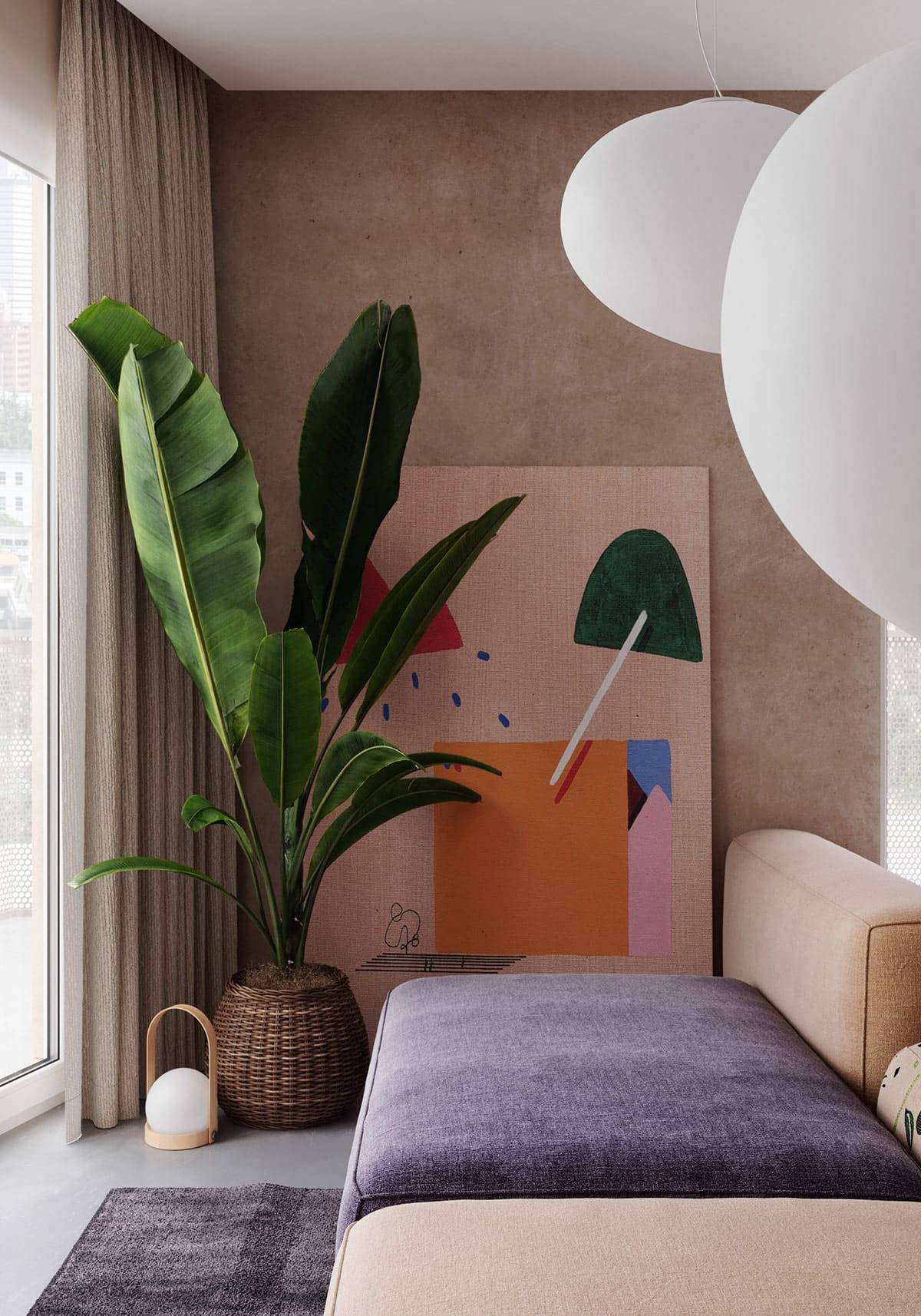 Яркие акценты в виде плафонов, выполненных в цвете фуксии, придают сдержанной комнате особый шарм