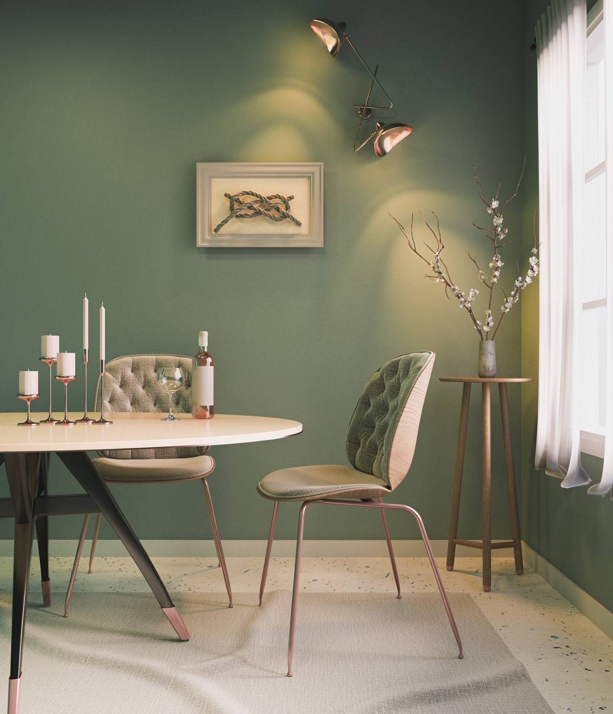 Вариант зеленого для нашего случая лучше подбирать не слишком активный, лучше слегка приглушенный, чтобы не создавать цветового конфликта из-за излишнего контраста