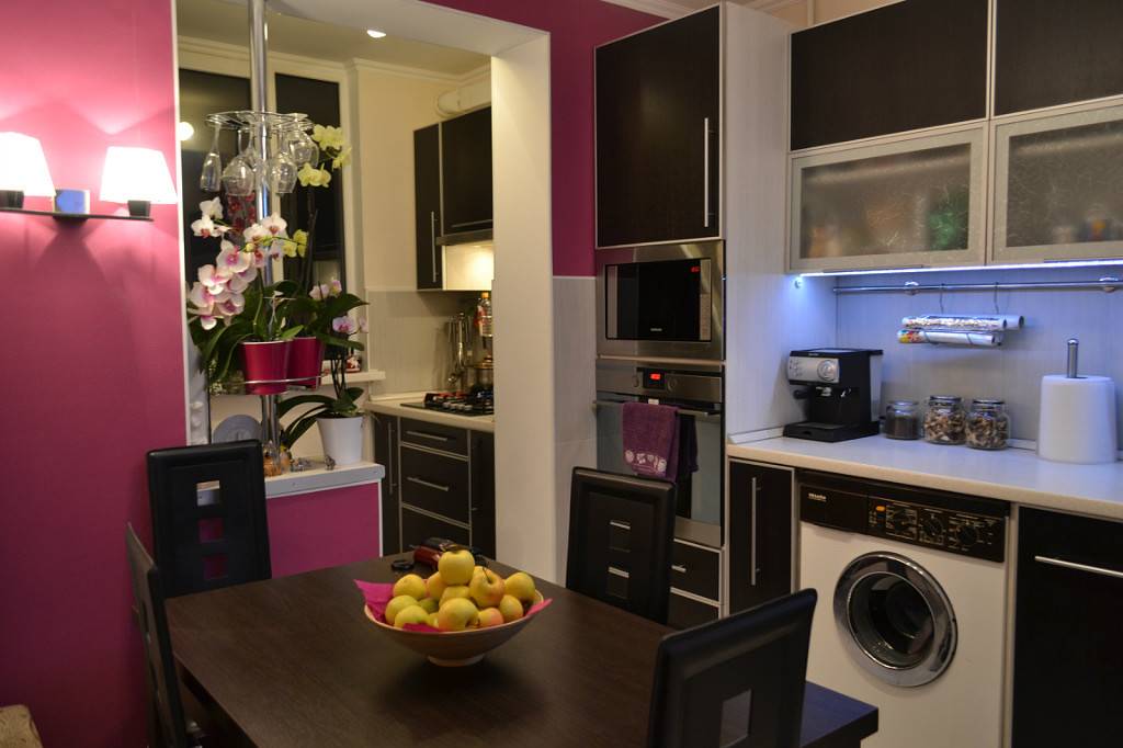 Неплохо смотрятся комнаты, оформленные в коричневом цвете с ярким пурпурным гарнитуром. Если последний сделать матовым, с приглушенными тонами, то интерьер вполне подойдет для кухни в классическом стиле.