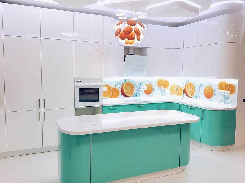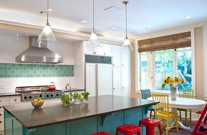 Кухня бирюзового цвета с островом и яркими акцентамиИсточник robdom.ru
