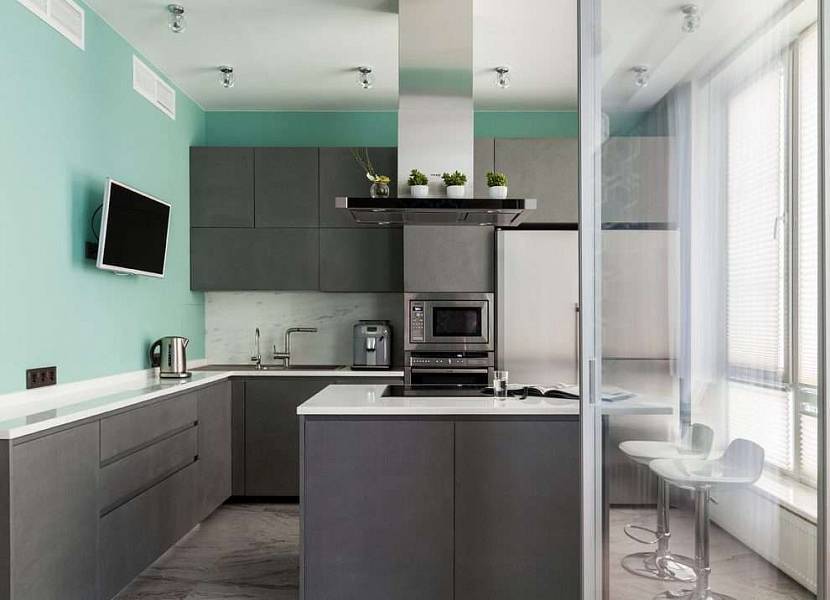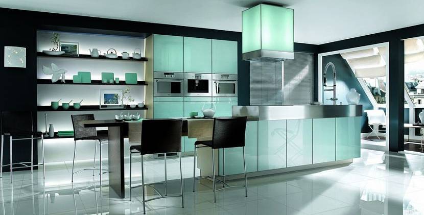 Бирюзовая кухня в интерьере, оформленном в современном стиле, прекрасно сочетается с оттенками серого цвета. В зависимости от насыщенности цветовой гаммы, интерьер может быть ярким, строгим, веселым, спокойным.