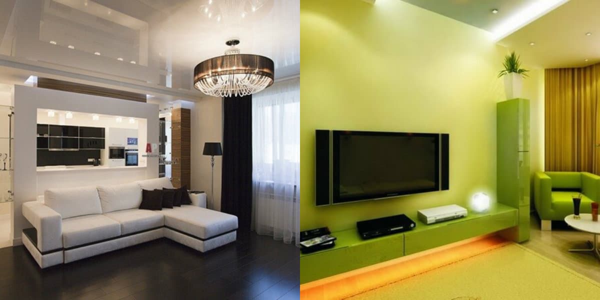 Совет: преобразить зоны с разными потолками поможет прием горизонтального комбинирования, при котором стена делится на две части и оформляется с помощью молдингов, бордюров или обойных лент. Сочетание светлых и темных оттенков в такой комбинации опустит потолок в вашем интерьере.