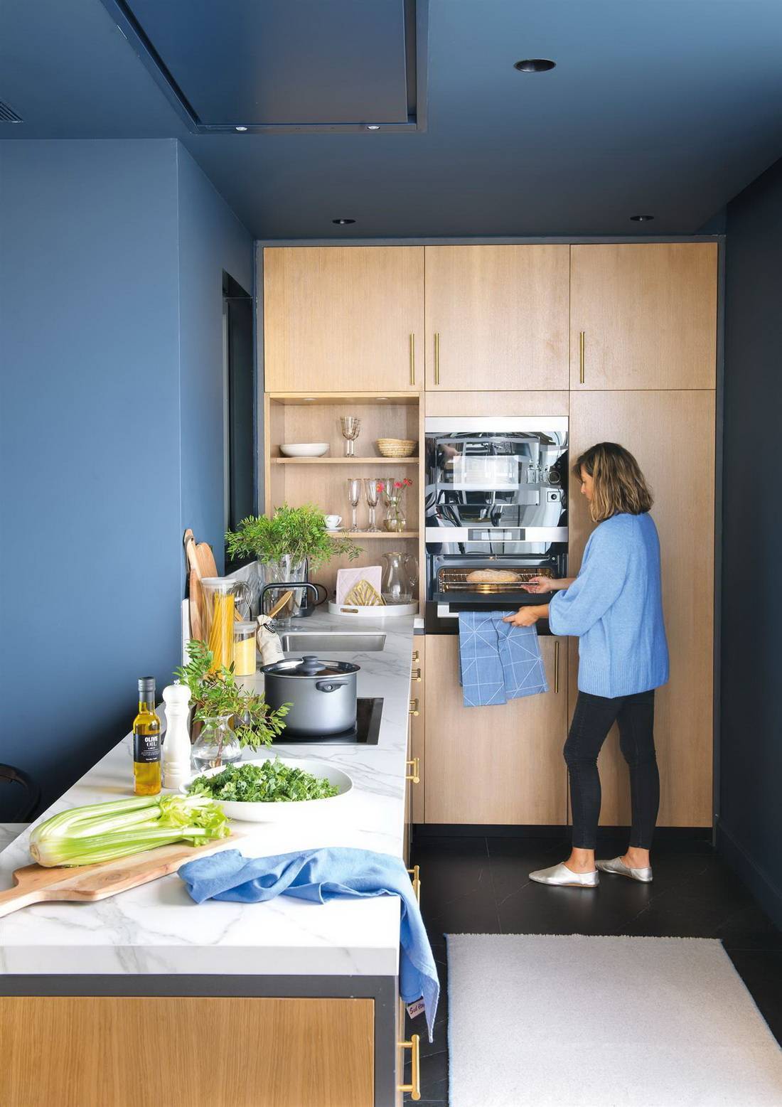 Если нужно добавить «опасные» для кухни цвета (синий, голубой или лиловый), коричневая основа — идеальное решение. Это природный оттенок, поэтому в паре с ним будут отлично смотреться родные ему цвета: