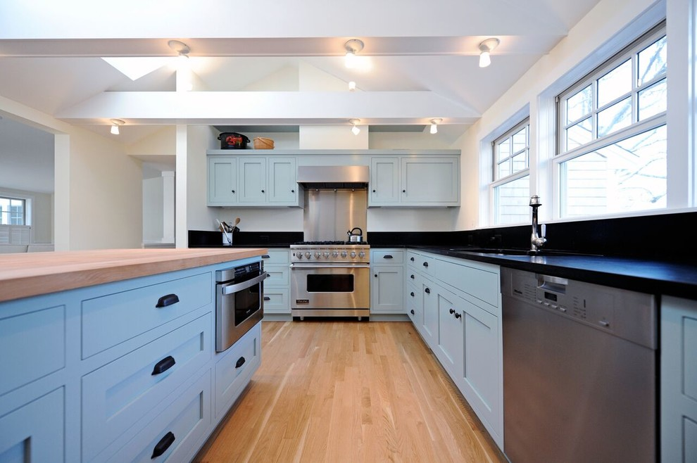Просторная светлая кухня в голубых тонах с черными акцентами