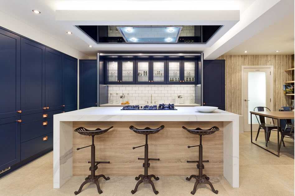 Черный цвет сегодня обретает популярность в связи с его деловитостью. Классика всегда остается в моде, но только в том случае, если грамотно подобрать цветовое сочетание. Для сочетания с черным цветом на кухне тона синего должны быть более светлыми. Если черный неуместен, подойдет темно-синяя кухня (фото демонстрирует тот факт, что она прекрасно справляется со своими задачами и делает помещение более светлым и уютным).