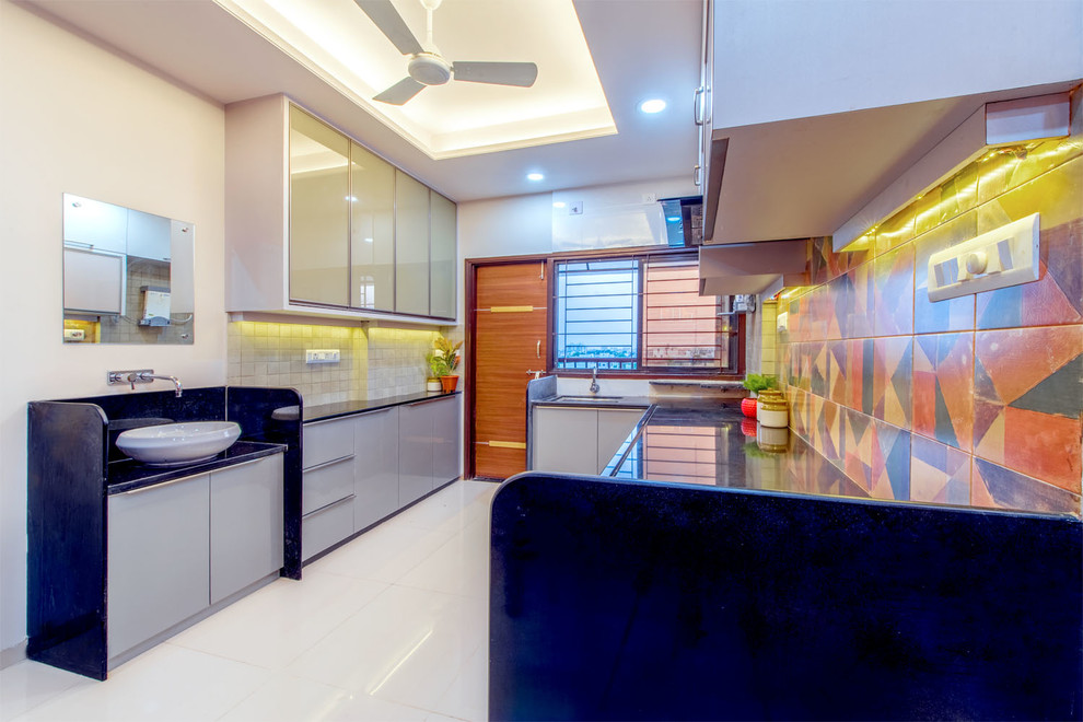 - Гармонично смотрится желтый фартук и синий гарнитур;